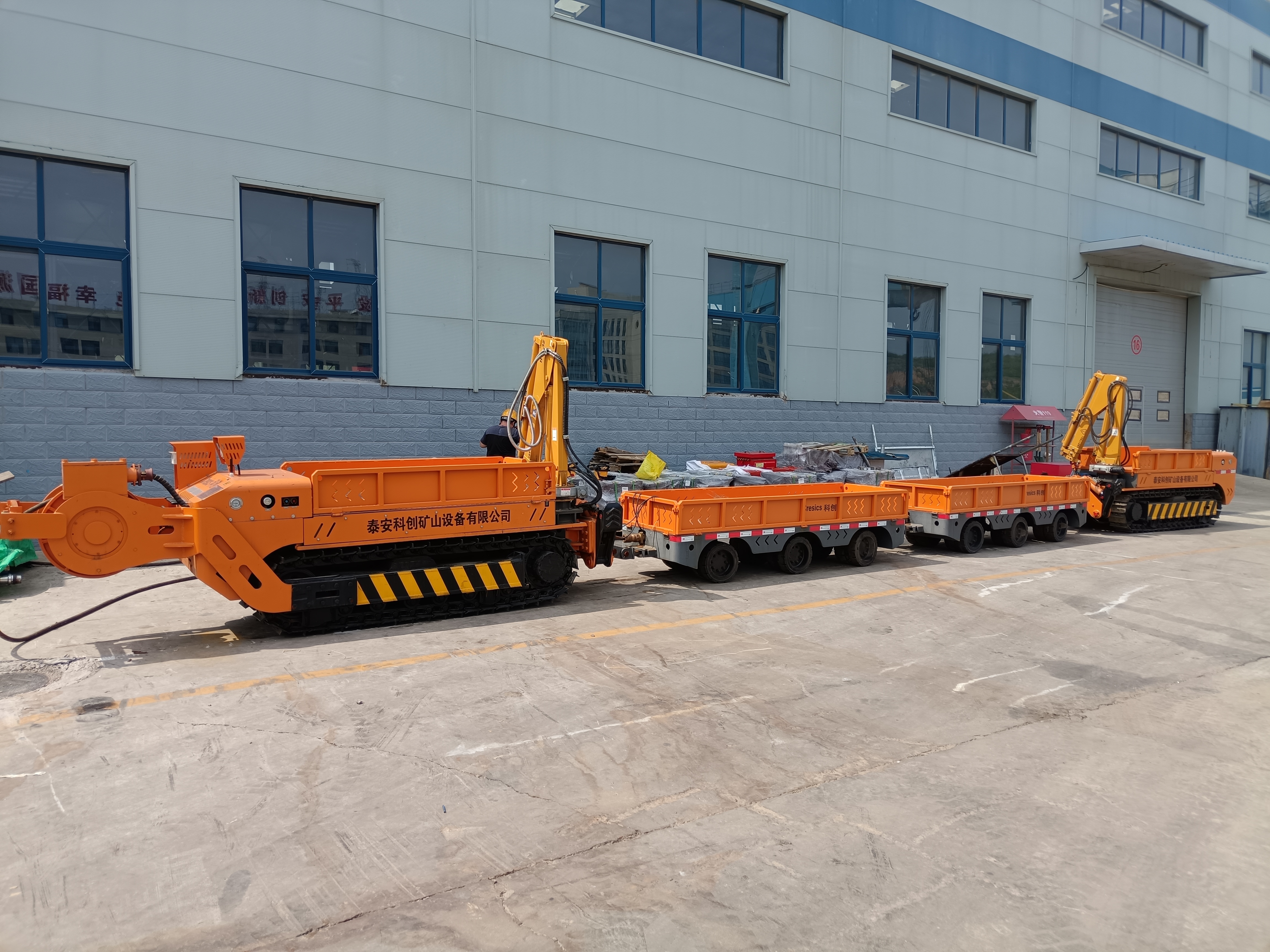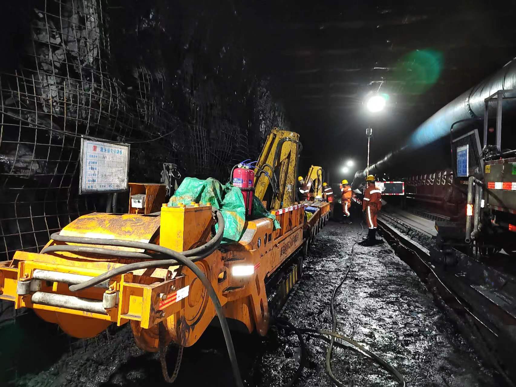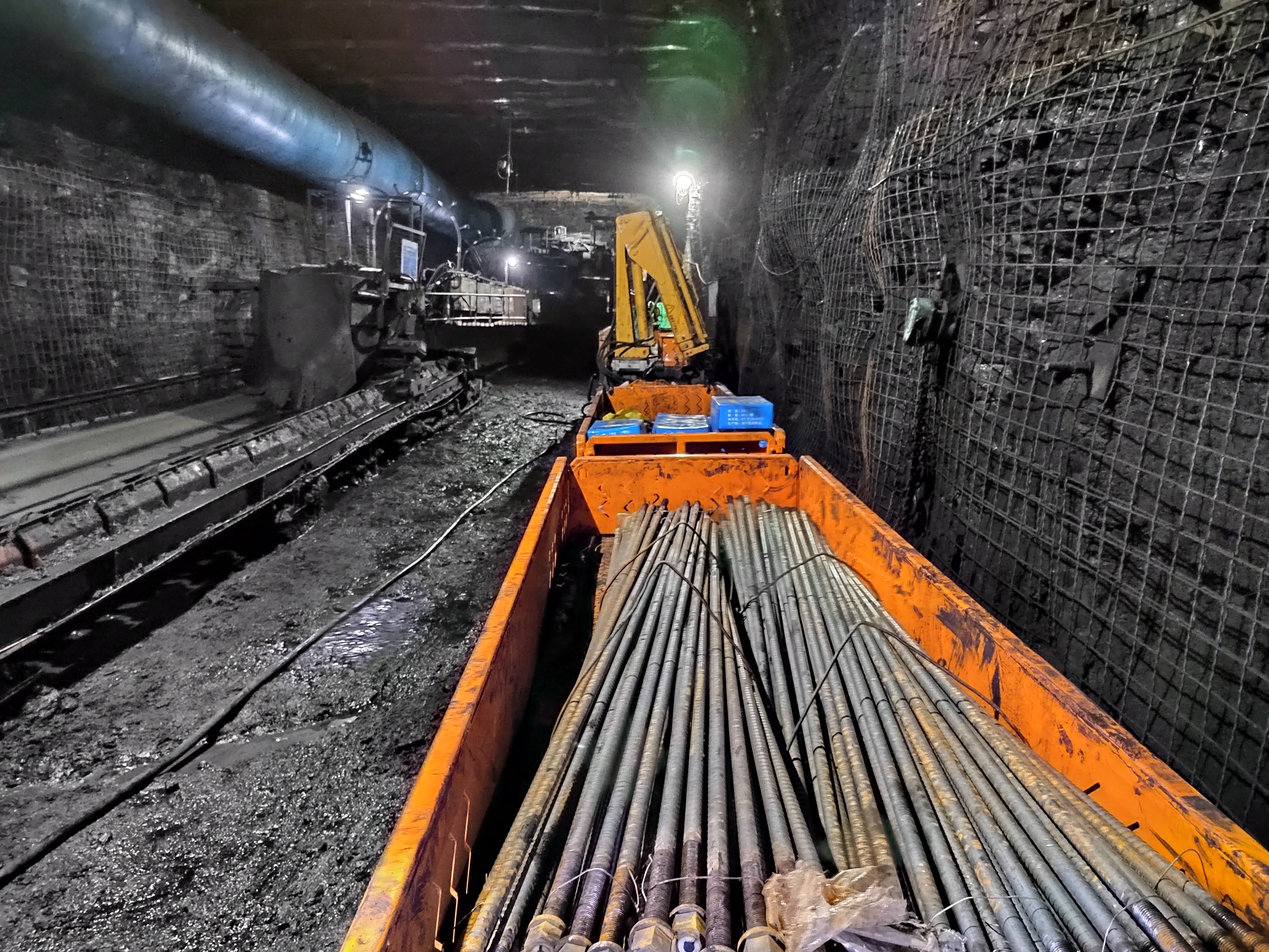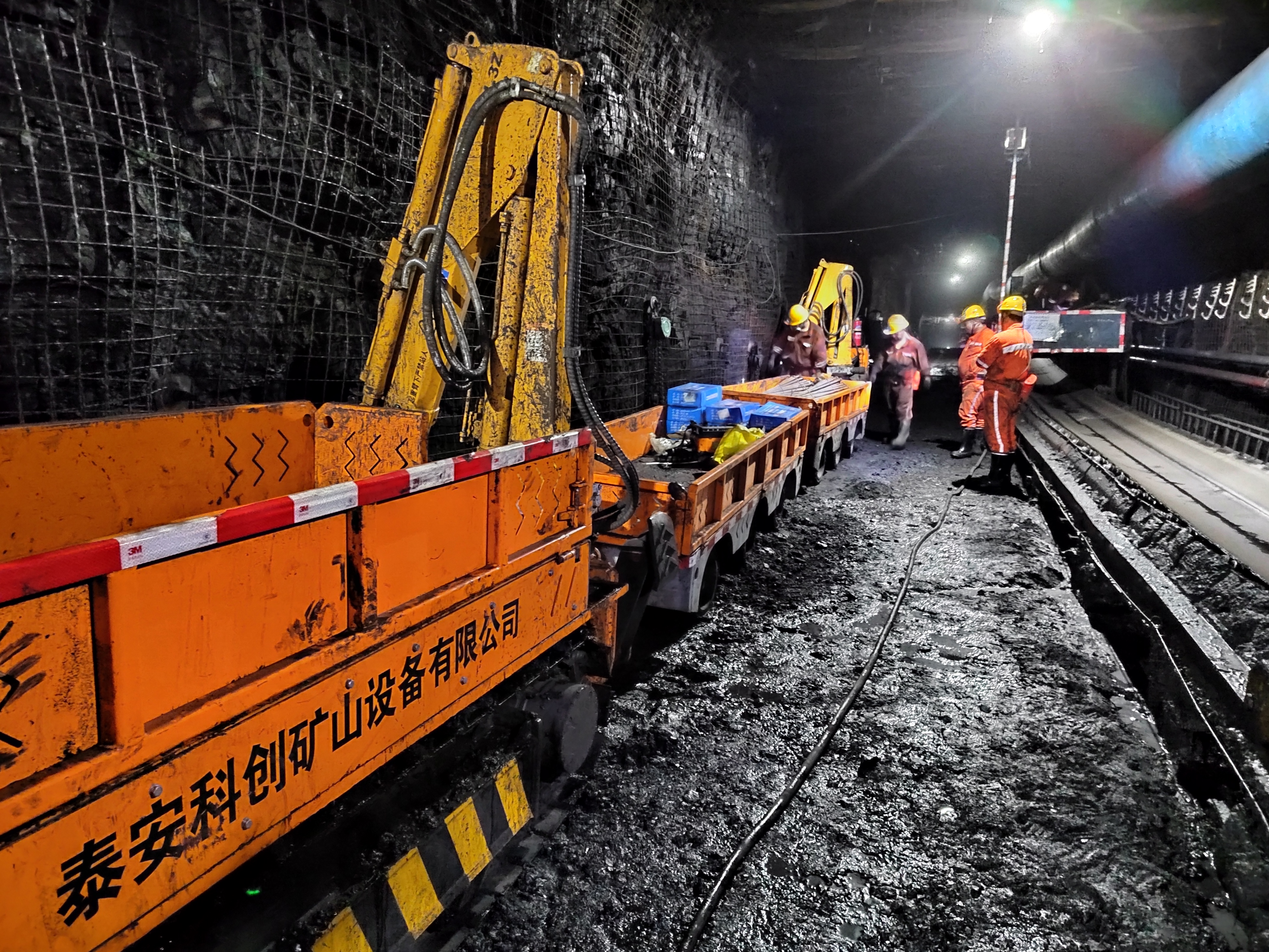 目前掘进作业中,受巷道空间条件所限,胶轮车等运输车辆只能把辅助材料运到距离迎头 50 米处,然后 由人工推、拉、扛等方式把物料卸到迎头位置,长期以来无法实现机械化运输辅材,该工艺工人劳动强度大, 工作效率低,安全隐患多。减轻职工劳动强度,提高人工效率,改善作业环境,探索无人化或少人化辅助运输 技术,成为急需解决的问题。