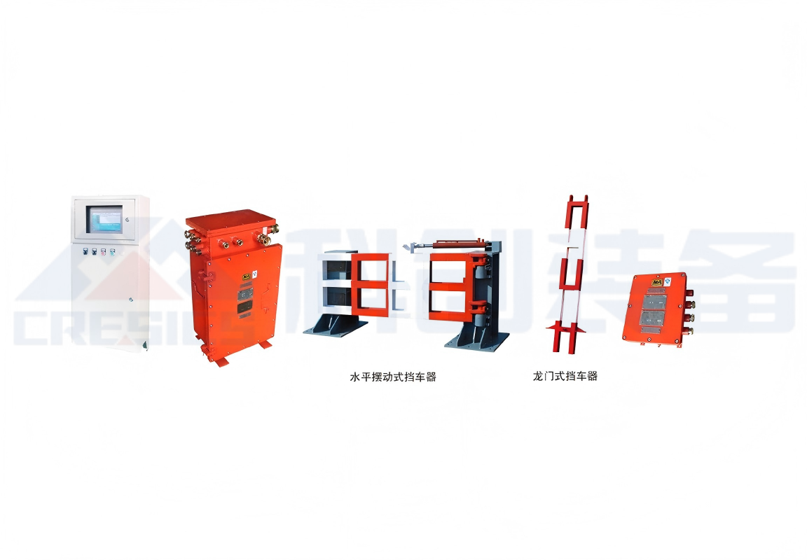 矿用挡车装置用电控装置主要由报警显示柜、电控箱、位置传感器等组成,主要适用于煤矿井口和车场中 道岔、阻车器、挡车器等装置的自动控制。该装置正常处于关闭状态且与绞车连锁,当车辆需要通过时根据操 作命令或者自动打开、关闭阻车系统,确保上部车场运输安全。