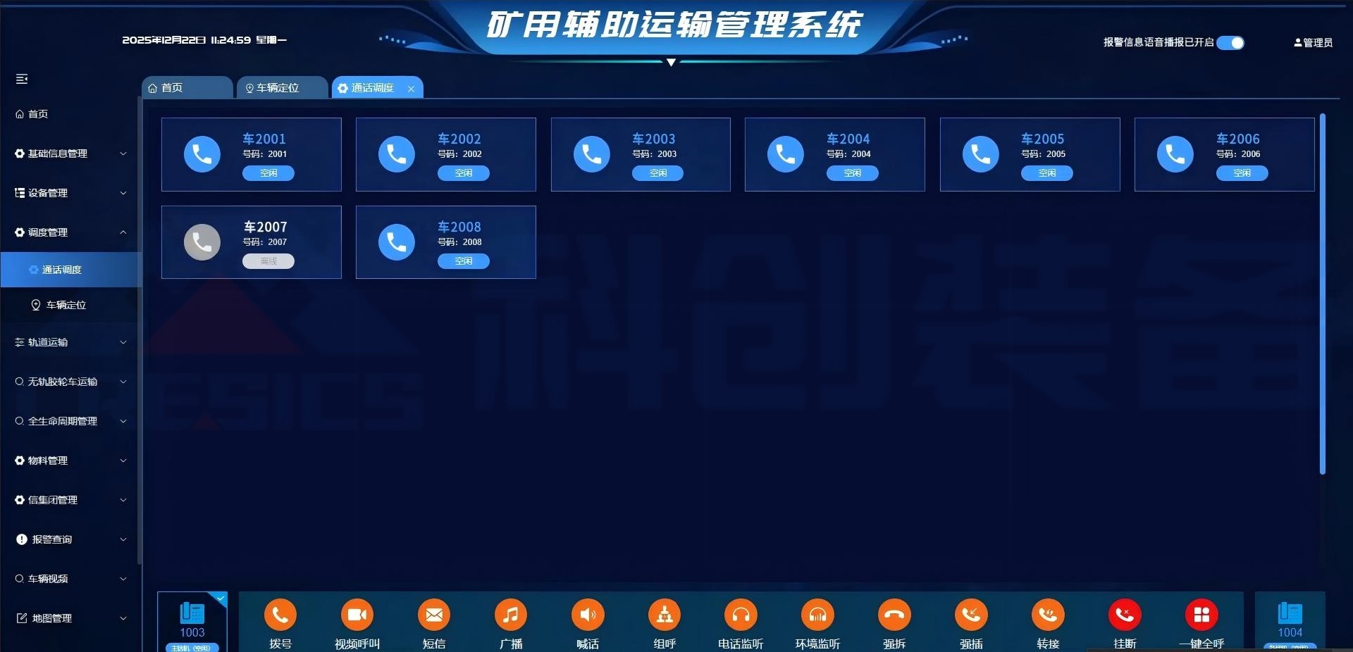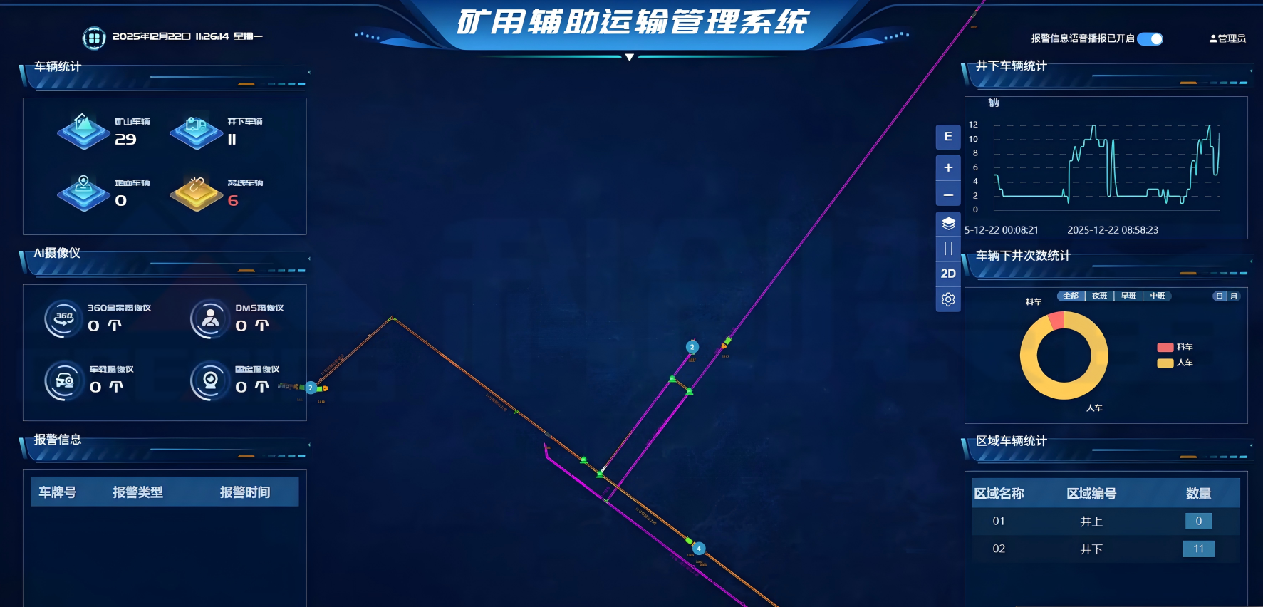 矿用机车运输管理系统适用于井下各类辅助运输设备智能化控制与调度管理。系统集成了井下路口信号控制、 安全违章管理、车辆信息引导、车辆全生命周期管理、智慧物流、轨道沿线设备控制等功能。基于 GIS“一张图” 以及 wifi 、4G 无线通信和 UWB 定位系统,可以实时获得井下各种车辆、人员的当前位置、车辆运行状态等信息: 通过对数据的存储、统计分析,可以生成当前井下车辆数量、车辆出入井时刻、运行路线等多种汇总信息,以便 于生产调度:通过承运信息共享对物资从仓库出库到运输、交接、回收的全过程实施定位跟踪和流转管控,实现 智慧物流和高效辅运的功能。系统采用了物联网技术、AI 智能识别技术、精确定位技术,其突出优势为图像与 数据相结合,监视与管理相结合,车载导航与远程调度相结合,实现矿山辅助运输车辆安全、高效、实时调度管 理。本系统适用于煤矿井下电机车运输系统、单轨吊运输系统和无轨胶轮车运输系统等。