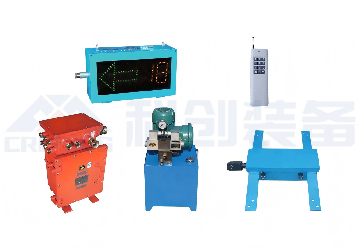 司控道岔装置安装于矿车轨道道岔处,代替人工扳道器,来实现矿车的变道。装置具有遥控器操作和手动 按钮两种方式。